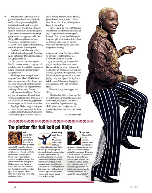 Att fånga henne i språnget är enda sättet. Angélique Kidjo tycks vara i ständig rörelse, både musikaliskt och personligt. Rastlöshet, nyfikenhet och oräddhet i perfekt kombination. Kvick i tanken är hon också, det är knappt jag hänger med i svängarna när hon med intensitet, allvar och humor berättar om sig själv samtidigt som jag hör hur hon mellan raderna utbyter vardagsfraser med folk hon möter. Som barn kallades hon Speedy Gonzales.